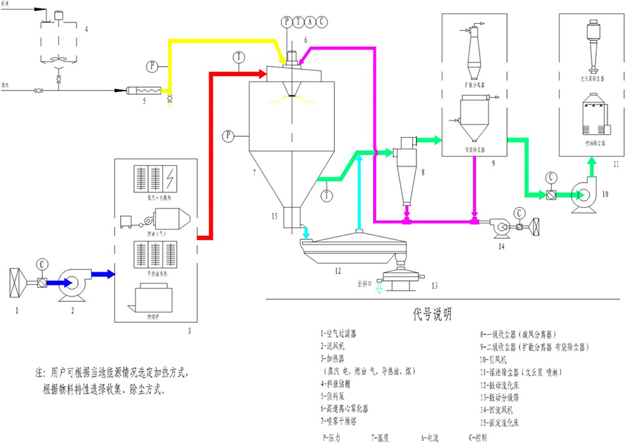 空氣通過過濾器和加熱裝置后,進入干燥塔頂部的熱風分配裝置,通過此裝置使潔凈的、熱的空氣均勻的進入干燥塔,并呈螺旋狀轉動,同時將料液送到安置在干燥塔頂中間的離心霧化器中,料液被離心霧化器霧化成霧滴,使料液和熱空氣的接觸面積增加,水分迅速蒸發,在短時間內干燥。再通過之后的除塵設備等,將干燥好的成品取出。成品連續的由收料口輸出,廢氣由引風機排空。